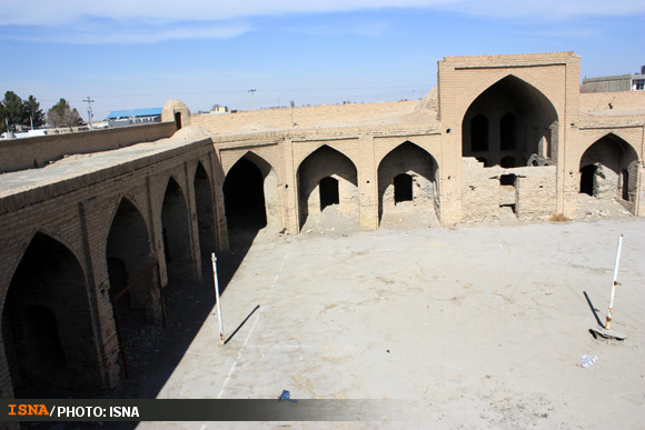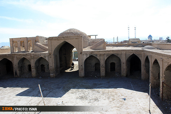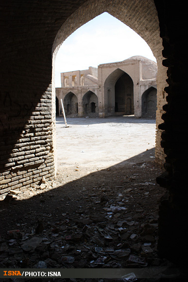 . Seljuk era mosque building, rectangular Gnbdkhanhay approximate dimensions of 11 m (inner side) on each side, in the north, east and west, three ports, and on the southern side of the altar, and there are two ports on either side of the It seems that the structure and decoration of the dome of the Taj is modeled Molk Mosque and was likely one of the two architects. . Honestly sanctuary at the altar of the mosque is famous Aljaytv. We get the mosque on an area approximately 68 in 53 m wide Phnhay, stucco and brick and delicately carved moldings they are obstreperous. It is not only rich in faith, purity and taste, is the creator of all this grandeur,.. Most ports Safavid mosque is blocked. Dome with a diameter of about 30/10 meters, a double shell roof beam is continuous with the lining. Lining, which is composed of eight ceiling beams are separated by eight lines. . Gnbdkhanh the south side, there is precious brick altar. The altar was built in the year 498 AH. . Qvarhay rectangular sanctuary with a beautiful brick arches of the vault Weekly Mogharnas frontage on both sides of the altar pentagram with two brick columns with brick Srstvnhay. . At the altar, with geometric designs in brick, plaster fragments and many inscriptions in Kufic is adorned with decorative and masonry. . In the Safavid era, many additions were made to the building, including the floor, south porch and north, east and west is stoic and Shbstanhay. Also during this period, Gnbdkhanh multiple ports are blocked. . Mosque × 40/19 × 30/19 m at the southern side of the entrance porch to a depth of 7 and 5/9 m on the northern side, the porch has a width of 7 and 5 meters deep. . On the northern side porch, two entries are located. East and west courtyards, two nave with arches made the span of the floor are multiplicative. Mnthaalyh south side of the east and west, two entries each other cemetery is located. Additional buildings of brick and brick veneer Inscriptional in the past there was a mosque by Shah Tahmasp I built.